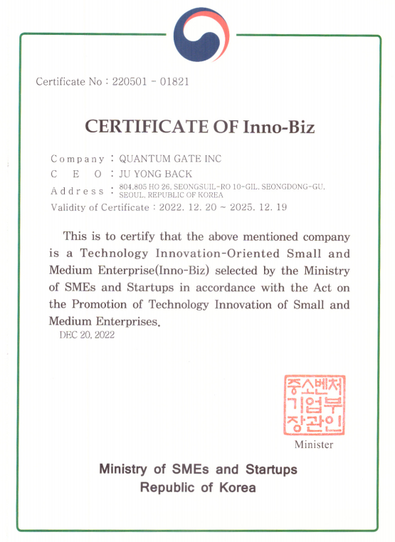 quantumgate Co., Ltd., has obtained a grade of A in the 'Inno-Biz' certification, a technology innovative small business selected by the Ministry of SMEs and Startups.